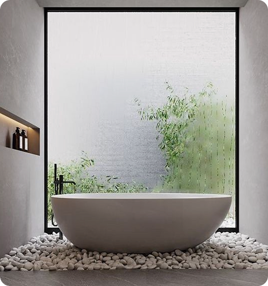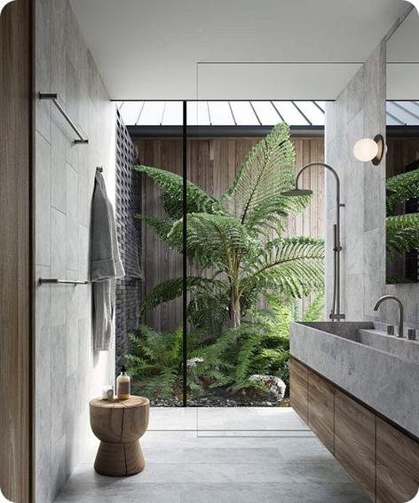 Mármol y madera en armonía, líneas minimalistas y amplios espejos.