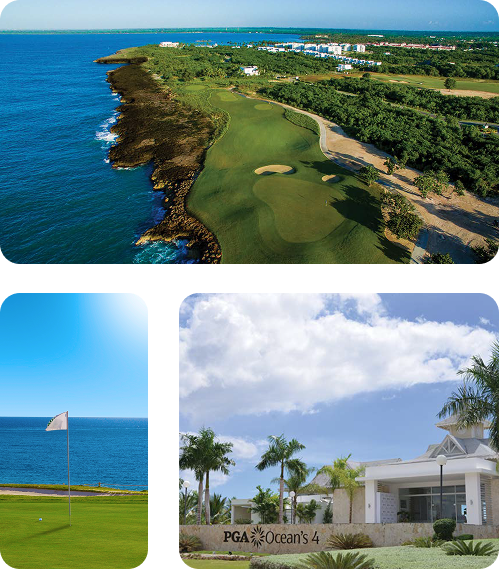 PGA Ocean’s 4, es un hermoso campo bañado por el Mar Caribe que reúne 4 grandes escenarios en un solo recorrido. Sus hoyos tipo: Parkland, Links escocés, Caribe y Desert forman una combinación perfecta de grandes lagos con sus cuatro hoyos junto al Mar.