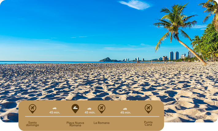 Playa Nueva Romana es un hermoso residencial con más de 600 hectáreas y bañado por el Mar Caribe donde encontrará todo lo que pueda imaginar para satisfacer sus más exigentes deseos de bienestar: dos kilómetros de playa, hermosas palmeras, dos magníficos campos de golf de primer nivel, dos hoteles 5 estrellas Bahia Principe, un exclusivo club de playa, zona comercial, canchas deportivas, parques infantiles, seguridad 24 horas del día.